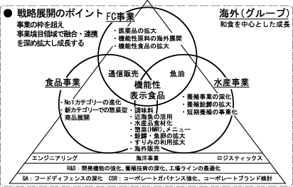 水産、食品、ファインケミカルの主要3事業の個々の強化に加え、それぞれの事業領域の境目となる分野で融合を進めることで、より高い成果を目指す。ファインケミカル事業をさらに先鋭化させると共に、長年培ってきた水産事業を核としつつ、水産および食品事業の連携をさらに強化することで成長を実現していく。
