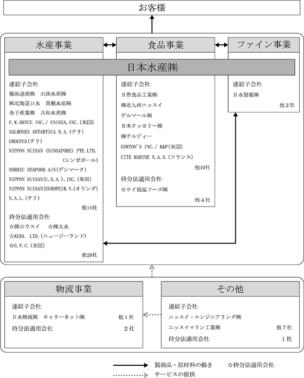 当社グループは、当社、子会社68社及び関連会社27社で構成され、水産事業、食品事業、ファイン事業及び物流事業を主な内容とし、さらに各事業に関連する研究及びサービス等を展開している。