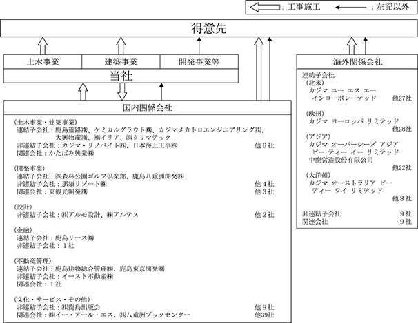 当社の国内関係会社が主に日本国内において行っている事業であり、大興物産㈱が建設資機材の販売を、カジマメカトロエンジニアリング㈱が建設用機械の納入を行っているほか、鹿島道路㈱、ケミカルグラウト㈱、㈱イリア、㈱クリマテック等が専門工事の請負を行っており、その一部を当社が発注している。