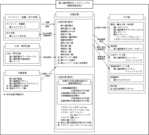 百貨店業 | ㈱三越伊勢丹、㈱札幌丸井三越、㈱函館丸井今井、㈱仙台三越、㈱新潟三越伊勢丹、㈱静岡伊勢丹、㈱名古屋三越、㈱広島三越、㈱高松三越、㈱松山三越、㈱岩田屋三越、伊勢丹(中国)投資有限公司(中華人民共和国)、天津伊勢丹有限公司(中華人民共和国)、天津濱海新区伊勢丹百貨有限公司(中華人民共和国)、上海梅龍鎮伊勢丹百貨有限公司(中華人民共和国)、成都伊勢丹百貨有限公司(中華人民共和国)、イセタン(シンガポール)Ltd.、イセタン(タイランド)Co.,Ltd.、イセタンオブジャパンSdn.Bhd.(マレーシア)、米国三越INC.、イタリア三越S.p.A.(イタリア)、㈱プランタン銀座、㈱うすい百貨店、㈱ジェイアール西日本伊勢丹、新光三越百貨股份有限公司(台湾)、アイティーエム クローバーCo.,Ltd.(タイランド) | 連結子会社 21社 |