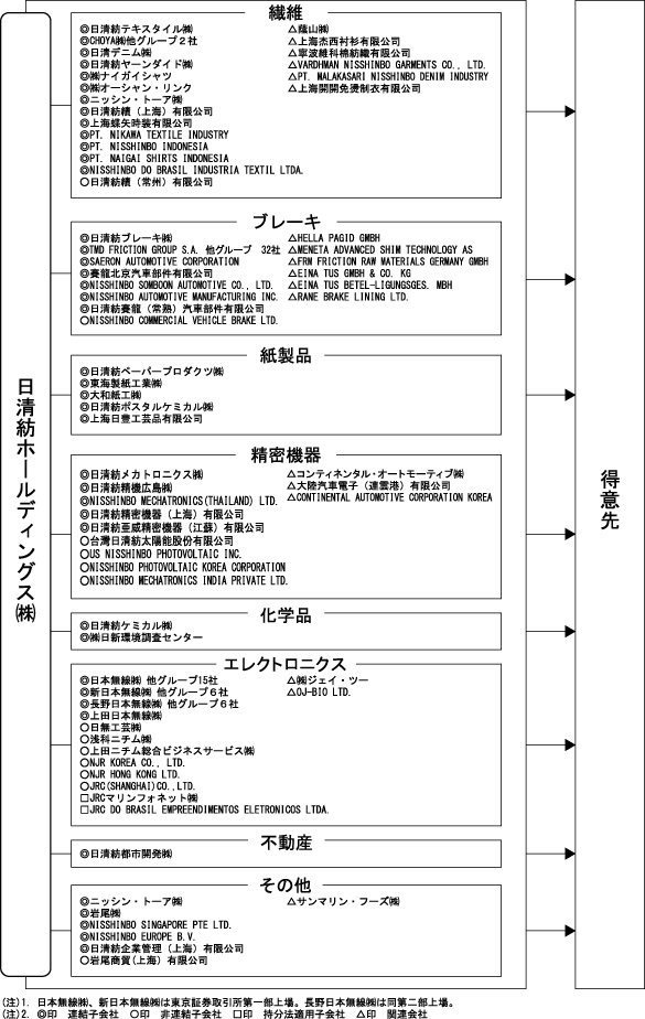繊維製品 | 日清紡テキスタイル㈱は、主力製品をPT.NIKAWA TEXTILE INDUSTRY及びPT.NISSHINBO INDONESIA 他海外3社から仕入れ、また、製造する製品の一部を日清デニム㈱で加工しています。製品は主として商社を通じて得意先に販売していますが、ニッシン・トーア㈱他国内7社海外4社を通じても販売しています。NISSHINBO DO BRASIL INDUSTRIA TEXTIL LTDA. 他6社は海外で繊維製品を販売しています。 |