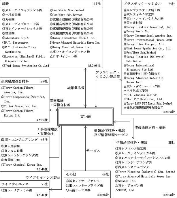 | 連結財務諸表提出会社(以下、東レ㈱という)は、合成繊維製品(糸・綿・織編物・人工皮革等)の製造・販売を行っている。一村産業㈱(連結子会社)、丸佐㈱(連結子会社)、東レインターナショナル㈱(連結子会社)、蝶理㈱(連結子会社)、Alcantara S.p.A. (連結子会社)、P.T. Indonesia Toray Synthetics (連結子会社)、Luckytex (Thailand) Public Company Limited (連結子会社)、Thai Toray Synthetics Co., Ltd. (連結子会社)、Penfabric Sdn. Berhad (連結子会社)、東麗合成繊維(南通)有限公司(連結子会社)、東麗酒伊織染(南通)有限公司(連結子会社)、東麗国際貿易(中国)有限公司(連結子会社)、Toray Industries (H.K.) Ltd. (連結子会社)、Toray Advanced Materials Korea Inc. (連結子会社)、Toray Chemical Korea Inc. (連結子会社)、東レ・オペロンテックス㈱(関連会社)、日本バイリーン㈱(関連会社)等117社は、合成繊維の製造・加工及び同製品の販売、アパレル製品の流通に携わっている。 |