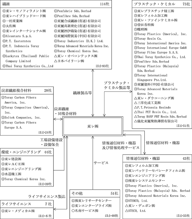 | 連結財務諸表提出会社(以下、東レ㈱という)は、合成繊維製品(糸・綿・織編物・人工皮革等)の製造・販売を行っている。一村産業㈱(連結子会社)、丸佐㈱(連結子会社)、東レインターナショナル㈱(連結子会社)、Alcantara S.p.A. (連結子会社)、P.T. Indonesia Toray Synthetics (連結子会社)、Luckytex (Thailand) Public Company Limited (連結子会社)、Thai Toray Synthetics Co., Ltd. (連結子会社)、Penfabric Sdn. Berhad (連結子会社)、東麗合成繊維(南通)有限公司(連結子会社)、東麗高新聚化(南通)有限公司(連結子会社)、東麗酒伊織染(南通)有限公司(連結子会社)、東麗国際貿易(中国)有限公司(連結子会社)、Toray Industries (H.K.) Ltd. (連結子会社)、Toray Advanced Materials Korea Inc. (連結子会社)、Toray Chemical Korea Inc. (連結子会社)、東レ・オペロンテックス㈱(関連会社)、日本バイリーン㈱(関連会社)等114社は、合成繊維の製造・加工及び同製品の販売、アパレル製品の流通に携わっている。 |