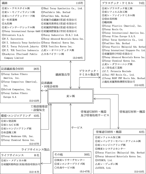 3 上記連結子会社のうち、当連結会計年度末現在、東レインターナショナル㈱、Toray Textiles Europe Ltd.、P.T. Indonesia Toray Synthetics、Penfibre Sdn. Berhad、東麗合成繊維(南通)有限公司、東麗酒伊織染(南通)有限公司、Toray Advanced Materials Korea Inc.、Toray Chemical Korea Inc.、Toray Plastics (America), Inc.、Toray Carbon Fibers Europe S.A.及び東麗(中国)投資有限公司は特定子会社である。
