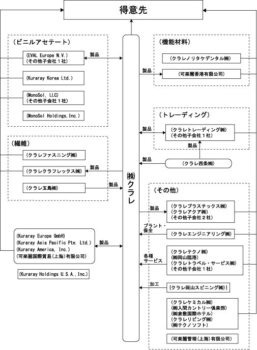 当社および当社の関係会社においては、「ビニルアセテート」、「イソプレン」、「機能材料」、「繊維」、「トレーディング」、「その他」の6部門に関係する事業を行っており、その製品は多岐にわたっています。関係会社のうち、連結子会社は34社、持分法を適用している非連結子会社は1社です。各事業における当社および関係会社の位置付けおよびセグメントとの関連は次のとおりです。
