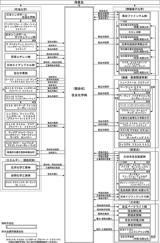 2 上記会社のうち、CDT ホールディングス リミテッド、ケンブリッジ ディスプレイ テクノロジー リミテッド、スミトモ ケミカル シンガポール プライベート リミテッド、スミトモ ケミカル アメリカ インコーポレーテッド、スミカ ポリマーズ アメリカ コーポレーション、東友ファインケム㈱、ベーラント U.S.A.コーポレーション、ベーラント バイオサイエンス コーポレーション、日本シンガポール石油化学㈱、SSLM㈱、大日本住友製薬㈱、ダイニッポン スミトモ ファーマ アメリカ ホールディングス インコーポレーテッド、サノビオン ファーマシューティカルズ インコーポレーテッド、ボストン バイオメディカル インコーポレーテッド、住化電子材料科技(無錫)有限公司、住華科技股份有限公司、大連住化金港化工有限公司、スミトモ ケミカル アジア プライベート リミテッド、日本シンガポールポリオレフィン㈱、ザ ポリオレフィン カンパニー(シンガポール)プライベート リミテッド、スミカ セラミックス ポーランド Sp. z o.o.、日本メジフィジックス㈱が特定子会社に該当する。