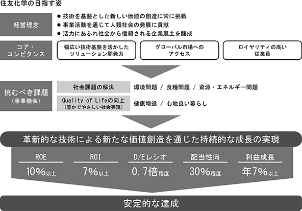 このような状況の下で、当社グループは、平成28年度を初年度とする「中期経営計画」に取り組んでいる。本計画では、「Change and Innovation~Create New Value~」をスローガンに掲げ、前中期経営計画で実現した強固な財務基盤をベースに、攻めの経営に取り組むことによって、持続的な成長を続けるレジリエント(回復力に富む)な住友化学グループへの変革をより一層加速していく。この中期経営計画は、以下を基本方針としている。