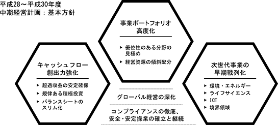 「環境・エネルギー」「ICT」「ライフサイエンス」を中心とした、「技術」で勝負できる事業分野に経営資源を投入し、社会が抱える諸課題に対し、「技術」を基盤とした新しい価値を提供する。