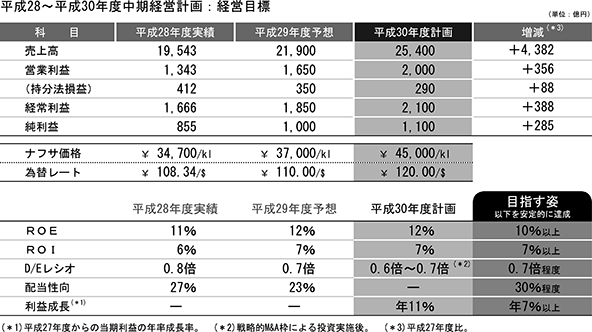 計画の最終年度である平成30年度には、為替レート120円/米ドル、ナフサ価格45,000円/klを前提に、売上高2兆5,400億円、営業利益2,000億円、経常利益2,100億円、親会社株主に帰属する当期純利益1,100億円の達成を目指しており、同年度のROEは12%、ROIは7%、D/Eレシオは0.7倍程度となる計画である。中期経営計画の初年度となる当連結会計年度は円高等の影響により厳しいスタートとなったが、平成29年度の業績は大幅な改善を予想している。
