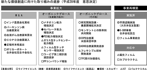 このような状況の下、当社グループは、全社を挙げて業績改善に努めるとともに、「事業ポートフォリオの高度化」、「キャッシュフロー創出力の強化」、「次世代事業の早期戦列化」等を基本方針とする中期経営計画(平成28年度~平成30年度)に基づき、持続的な成長を続けるレジリエント(回復力に富む)な住友化学グループへの変革をより一層加速すべく取り組んできた。