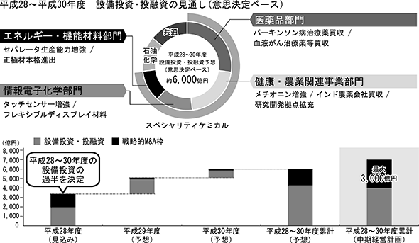このため、中期経営計画の3年間で4,000億円の設備投資・投融資を決定することに加え、スペシャリティケミカル分野の早期拡充に向け、最大3,000億円の戦略的M&Aも実施したいと考えている。最大7,000億円の設備投資・投融資のうち約7~8割はライフサイエンスを中心としたスペシャリティケミカル分野に投資する計画である。
