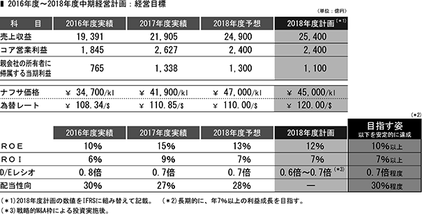 中期経営計画では、最終年度である2018年度には、為替レート120円/ドル、ナフサ価格45,000円/klを前提に、売上収益2兆5,400億円、コア営業利益2,400億円、親会社の所有者に帰属する当期利益1,100億円を達成し、同年度のROEは12%、ROIは7%、D/Eレシオは0.7倍程度となる計画でありました。中期経営計画の2年目となる2017年度は、医薬品や石油化学製品の販売好調により、過去最高益を記録することができました。2018年度は、石油化学製品の需給悪化を見込んでいますが、中期経営計画で目標とした業績を概ね達成できる予想であります。