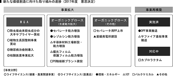 このような状況の下、当社グループは、全社を挙げて業績改善に努めるとともに、「事業ポートフォリオの高度化」、「キャッシュフロー創出力の強化」、「次世代事業の早期戦列化」等を基本方針とする中期経営計画(2016年度~2018年度)に基づき、持続的な成長を続けるレジリエント(回復力に富む)な住友化学グループへの変革をより一層加速すべく取り組んでまいりました。