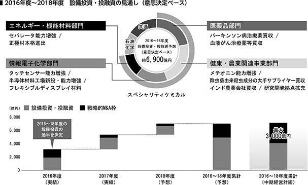 このため、中期経営計画の3年間で4,000億円の設備投資・投融資を決定することに加え、スペシャリティケミカル分野の早期拡充に向け、最大3,000億円の戦略的M&Aも実施したいと考えております。最大7,000億円の設備投資・投融資のうち約7~8割はライフサイエンスを中心としたスペシャリティケミカル分野に投資する計画であります。