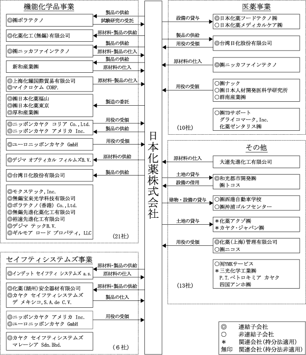 医 薬 品: | 当社は、医療用医薬品、医療機器、医薬原薬・中間体、診断薬等を製造・販売しております。連結子会社の日本化薬フードテクノ㈱は、食品、食品品質保持剤及び食品添加物等を製造・販売しております。当社は、同社に製造設備を貸与しております。連結子会社の台湾日化股份有限公司は、当社の製品の一部を販売しております。 |