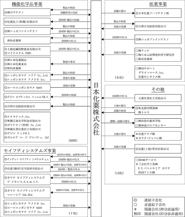 医 薬 品: | 当社は、医療用医薬品、医療機器、医薬原薬・中間体、診断薬等を製造・販売しております。連結子会社の日本化薬フードテクノ㈱は、食品、食品品質保持剤及び食品添加物等を製造・販売しております。当社は、同社に製造設備を貸与しております。連結子会社の台湾日化股份有限公司は、当社の製品の一部を販売しております。 |