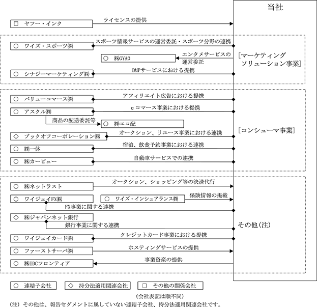 当社の親会社であるソフトバンクグループ(株)は、持株会社として傘下に多数の関係会社を擁し、国内通信事業、スプリント事業、ヤフー事業、流通事業、その他の事業など、様々な分野・地域で事業活動を行っております。当社グループは、「ヤフー事業」に属しております。