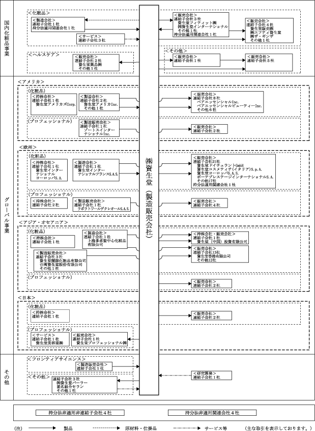当社グループは、当社、子会社98社(連結子会社94社、持分法非適用非連結子会社4社)及び関連会社7社(持分法適用関連会社3社、持分法非適用関連会社4社)で構成され、化粧品、化粧用具、トイレタリー製品、理・美容製品、美容食品、医薬品の製造・販売を主な事業内容とし、更に各事業に関連する研究及びその他のサービス等の事業活動を展開しております。