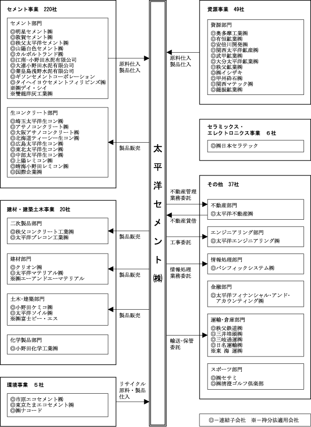 当社グループ(当社及び当社の関係会社)は、当社(太平洋セメント株式会社)、子会社234社及び関連会社103社で構成され、セメント事業、資源事業、環境事業、建材・建築土木事業、セラミックス・エレクトロニクス事業、その他に不動産、エンジニアリング、情報処理、金融、運輸・倉庫、スポーツ等の事業を営み、また、新規事業も積極的に展開しております。