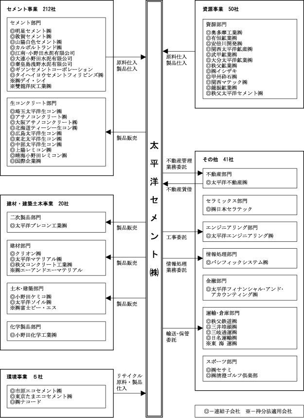 当社グループ(当社及び当社の関係会社)は、当社(太平洋セメント株式会社)、子会社228社及び関連会社100社で構成され、セメント事業、資源事業、環境事業、建材・建築土木事業、その他に不動産、セラミックス、エンジニアリング、情報処理、金融、運輸・倉庫、スポーツ等の事業を営み、また、新規事業も積極的に展開しております。