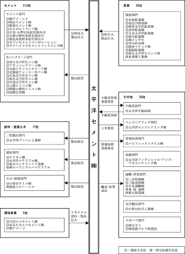 当社グループ(当社及び当社の関係会社)は、当社(太平洋セメント株式会社)、子会社202社及び関連会社105社で構成され、セメント事業、資源事業、環境事業、建材・建築土木事業、その他に不動産、エンジニアリング、情報処理、金融、運輸・倉庫、化学製品、スポーツ等の事業を営み、また、新規事業も積極的に展開しております。