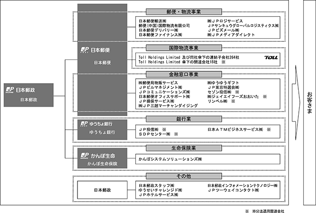 3.上記関係会社のうち、ゆうちょ銀行及びかんぽ生命保険については、平成27年9月10日付で有価証券届出書を提出し、また、平成27年11月4日付で東京証券取引所市場第一部に株式を上場したことにより、平成28年3月期より有価証券報告書を提出しております。