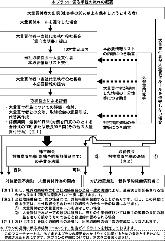 その結果、平成26年5月23日開催の当社取締役会において、当社定款第35条に基づき、同年6月25日開催の当社定時株主総会において株主の皆様のご賛同を得て承認可決されることを条件として、旧プランから継続して、当社株式の大量買付行為に関する対応策(以下「本プラン」といいます。)を導入することを決議し、同株主総会において承認され、本プランが導入されました。