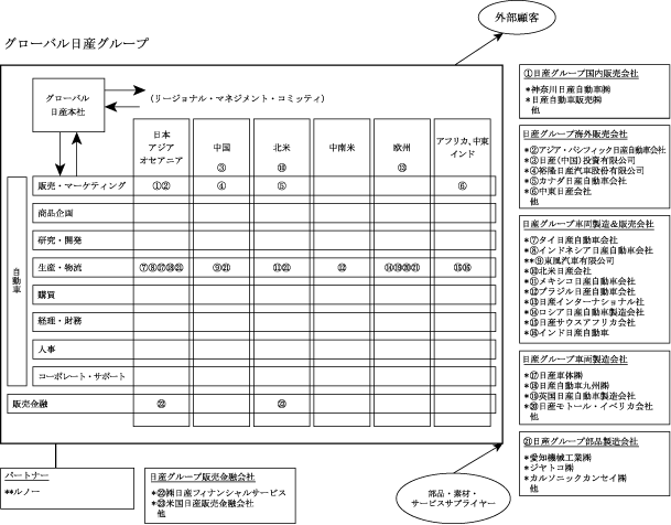 当社グループは世界的な本社機能として「グローバル日産本社」を設置し、各事業への資源配分を決定するとともに、グループ全体の事業を管理している。また当社グループは6つの地域のマネジメント・コミッティによる地域管理と研究・開発、購買、生産といった機能軸による地域を越えた活動を有機的に統合した組織(グローバル日産グループ)により運営されている。
