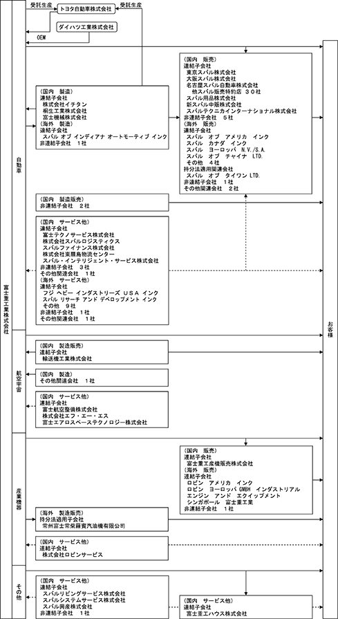 なお、トヨタ自動車株式会社(以下トヨタ)及びダイハツ工業株式会社(以下ダイハツ)と開発・生産における協力関係のもと、スバル オブ インディアナ オートモーティブ インクにおいてトヨタ車の受託生産を行っているほか、トヨタから小型自動車のOEM供給を、ダイハツからは軽自動車のOEM供給を受けております。また、当社の国内生産拠点である群馬製作所において、トヨタと共同開発したスポーツカーの生産を行っております。