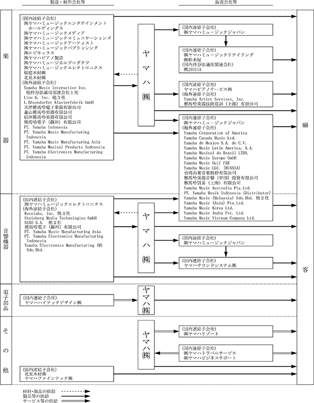 主に㈱ヤマハミュージカルプロダクツ他国内製造子会社及び天津雅馬哈電子楽器有限公司、PT. Yamaha Music Manufacturing Asia、杭州雅馬哈楽器有限公司他海外製造子会社が製造し、当社が販売すると共に㈱ヤマハミュージックジャパン他国内販売子会社及びYamaha Music Europe GmbH、Yamaha Corporation of America、雅馬哈楽器音響(中国)投資有限公司他海外販売子会社を通じ販売しております。