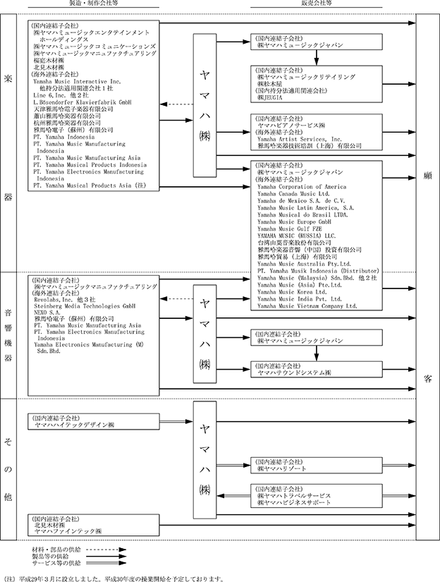 主に㈱ヤマハミュージックマニュファクチュアリング他国内製造子会社及びPT. Yamaha Music Manufacturing Asia、杭州雅馬哈楽器有限公司、天津雅馬哈電子楽器有限公司他海外製造子会社が製造し、当社が販売すると共に㈱ヤマハミュージックジャパン他国内販売子会社及びYamaha Music Europe GmbH、Yamaha Corporation of America、雅馬哈楽器音響(中国)投資有限公司他海外販売子会社を通じ販売しております。