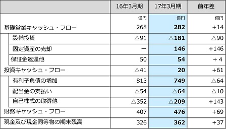 ・営業債権の増加を除く基礎営業キャッシュ・フローは、税引前利益の増加などにより前年より14億円増加し282億円となりました。(注)