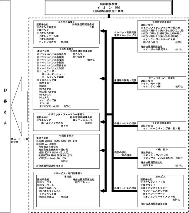 イオン北海道㈱、イオン九州㈱、㈱サンデー、ユナイテッド・スーパーマーケット・ホールディングス㈱、マックスバリュ北海道㈱、マックスバリュ東北㈱、マックスバリュ東海㈱、マックスバリュ中部㈱、マックスバリュ西日本㈱、マックスバリュ九州㈱、オリジン東秀㈱、ミニストップ㈱、イオンフィナンシャルサービス㈱、イオンモール㈱、㈱ツヴァイ、㈱イオンファンタジー、イオンディライト㈱、㈱コックス、㈱ジーフット、ウエルシアホールディングス㈱