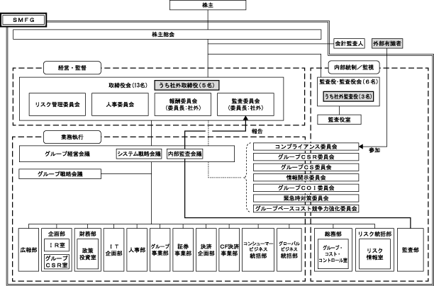 また、グループ各社の業務計画に関する事項については、「グループ戦略会議」を設け、当社及びグループ各社の経営レベルで意見交換・協議・報告を行っております。さらに、株式会社三井住友銀行については、当社の取締役13名(うち社外取締役5名)のうち、7名が同行の取締役を兼務することを通じて、業務執行状況の監督を行っております。また、当社の直接出資子会社のうち、三井住友ファイナンス&リース株式会社、SMBCコンシューマーファイナンス株式会社及び株式会社日本総合研究所の3社については、当社の取締役が各社の取締役に就任し、業務執行状況の監督を行っております。
