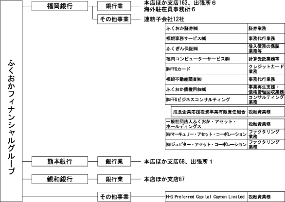 福岡銀行、熊本銀行及び親和銀行において、本店のほか支店等により運営されており、預金業務、貸出業務、内国為替業務、外国為替業務等を行っております。
