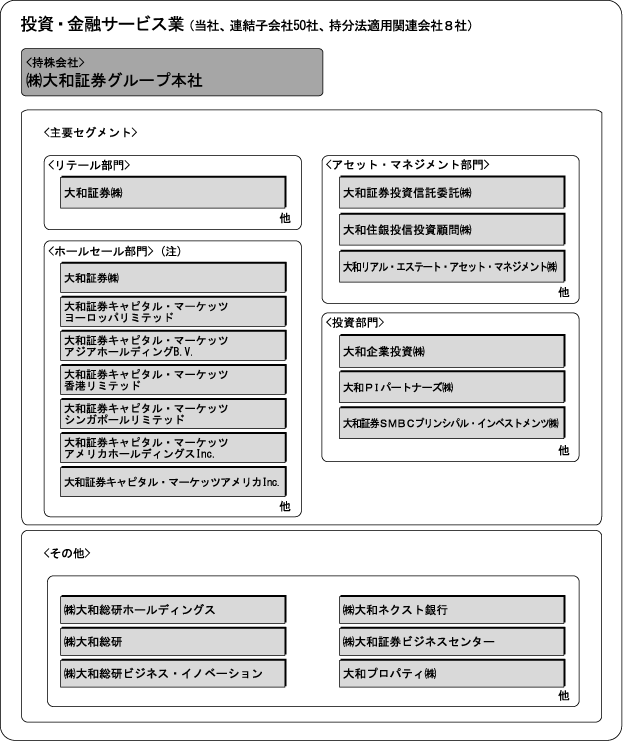 当社及び当社の関係会社(連結子会社50社、持分法適用関連会社8社)の主たる事業は有価証券関連業を中核とする投資・金融サービス業であり、具体的な事業として有価証券及びデリバティブ商品の売買等及び売買等の委託の媒介、有価証券の引受け及び売出し、有価証券の募集及び売出しの取扱い、有価証券の私募の取扱いその他有価証券関連業並びに銀行業その他の金融業等を営んでおります。当社及び当社の関係会社は、日本をはじめ、欧州、アジア、米州の主要な金融市場に営業拠点を設置し、グローバルに展開するネットワークにより世界中のお客様の資金調達と運用の双方のニーズに対応した幅広いサービスを提供しております。
