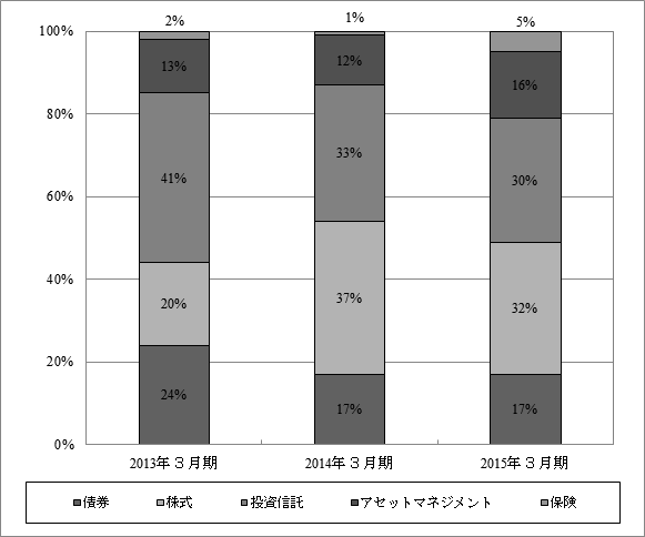 上記のとおり、2015年3月期は、投資信託関連とアセットマネジメント関連の収益構成比は45%から46%に増加しました。一方株式関連の収益構成比が2014年3月期の37%から32%に減少しました。債券関連の収益構成比は2014年3月期と同様に17%でした。また、保険の代理店手数料の収益構成比は5%となりました。