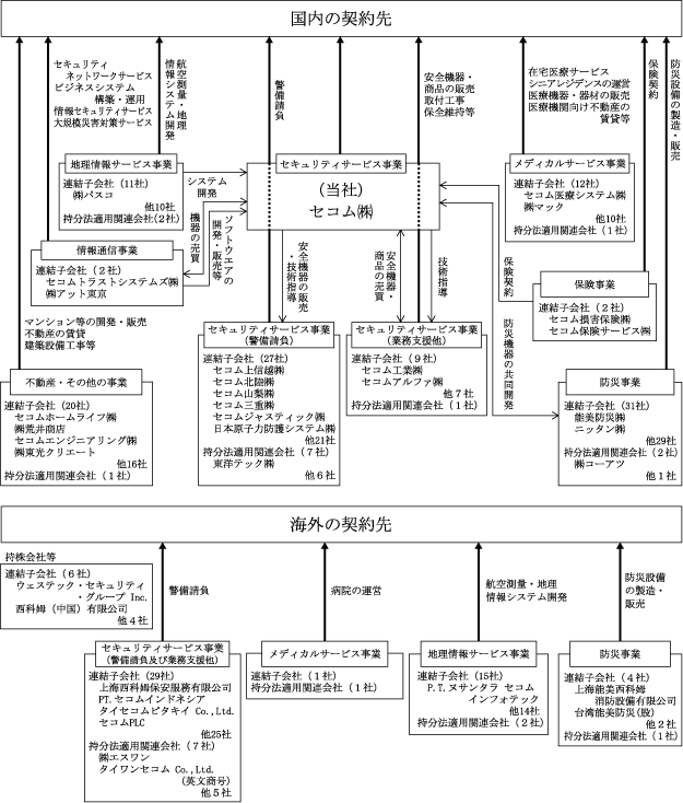 当社が提供しておりますセントラライズドシステム(オンライン・セキュリティシステム)をはじめとする各種のセキュリティサービスは、国内の子会社ではセコム上信越株式会社、セコム北陸株式会社、セコム山梨株式会社、セコム三重株式会社、セコムジャスティック株式会社および日本原子力防護システム株式会社他21社が事業を展開しております。関連会社では、東洋テック株式会社他6社がセキュリティサービスを提供しております。当社はこれらのグループ各社に対して技術指導や安全機器の売渡しを行っております。