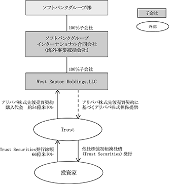 当社100%子会社であるソフトバンクグループインターナショナル合同会社の100%子会社であるWest Raptor Holdings, LLC(以下「WRH LLC」)は、2016年6月10日(米国時間)、Trustとの間で、同社へのアリババ普通株式の売却に係る先渡売買契約を締結しました。当該契約に基づき、WRH LLCは保有するアリババ株式をTrustへ担保として供しました。またWRH LLCは、Trust Securitiesの払込時点(2016年6月10日(米国時間)において、Trust Securitiesの発行による手取金相当額約54億米ドル(将来の四半期毎の利払いに備えた米国債の購入金額およびTrust Securitiesの発行のために必要なTrustの諸経費を除く)をTrustから受領しました。